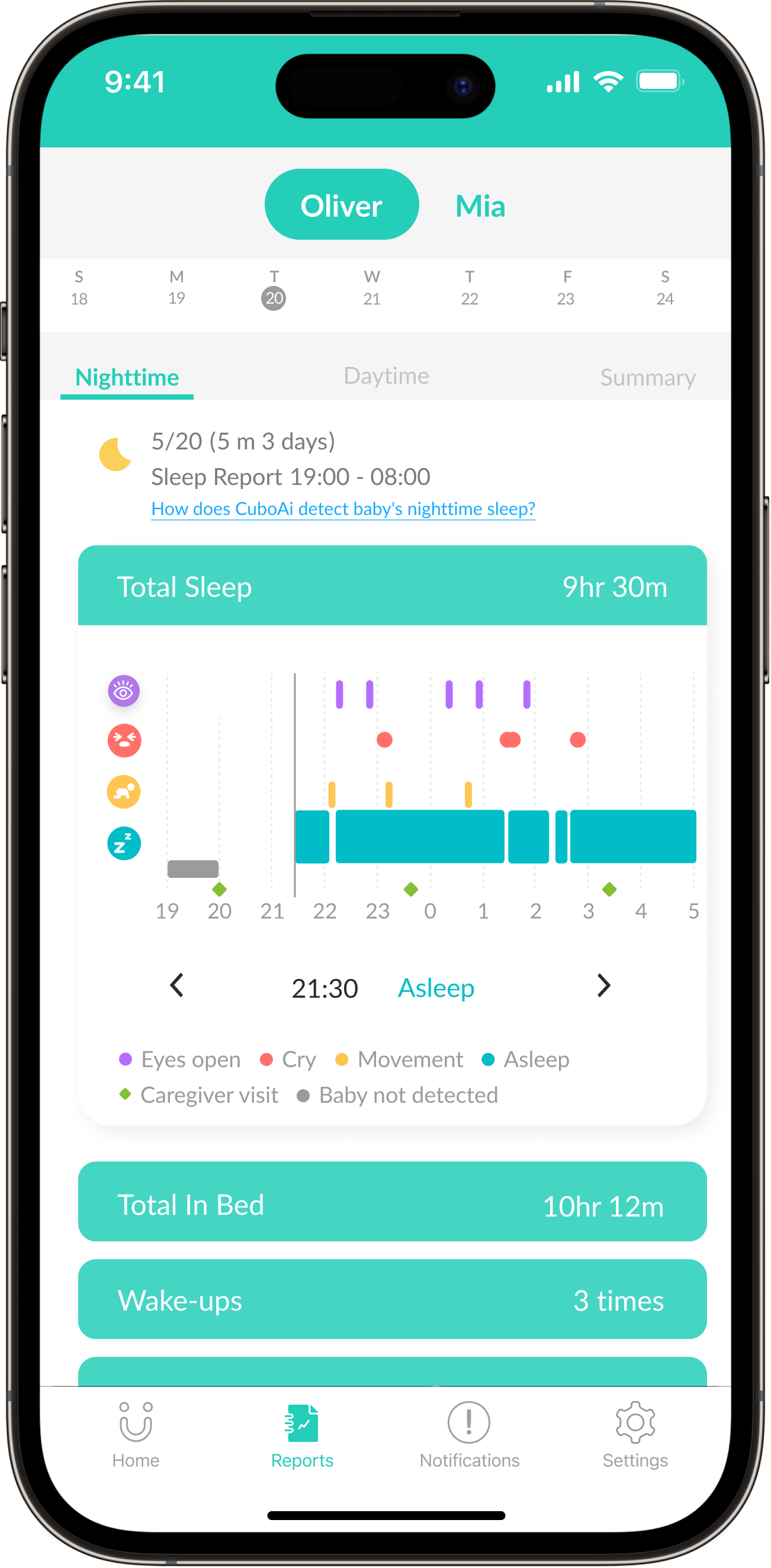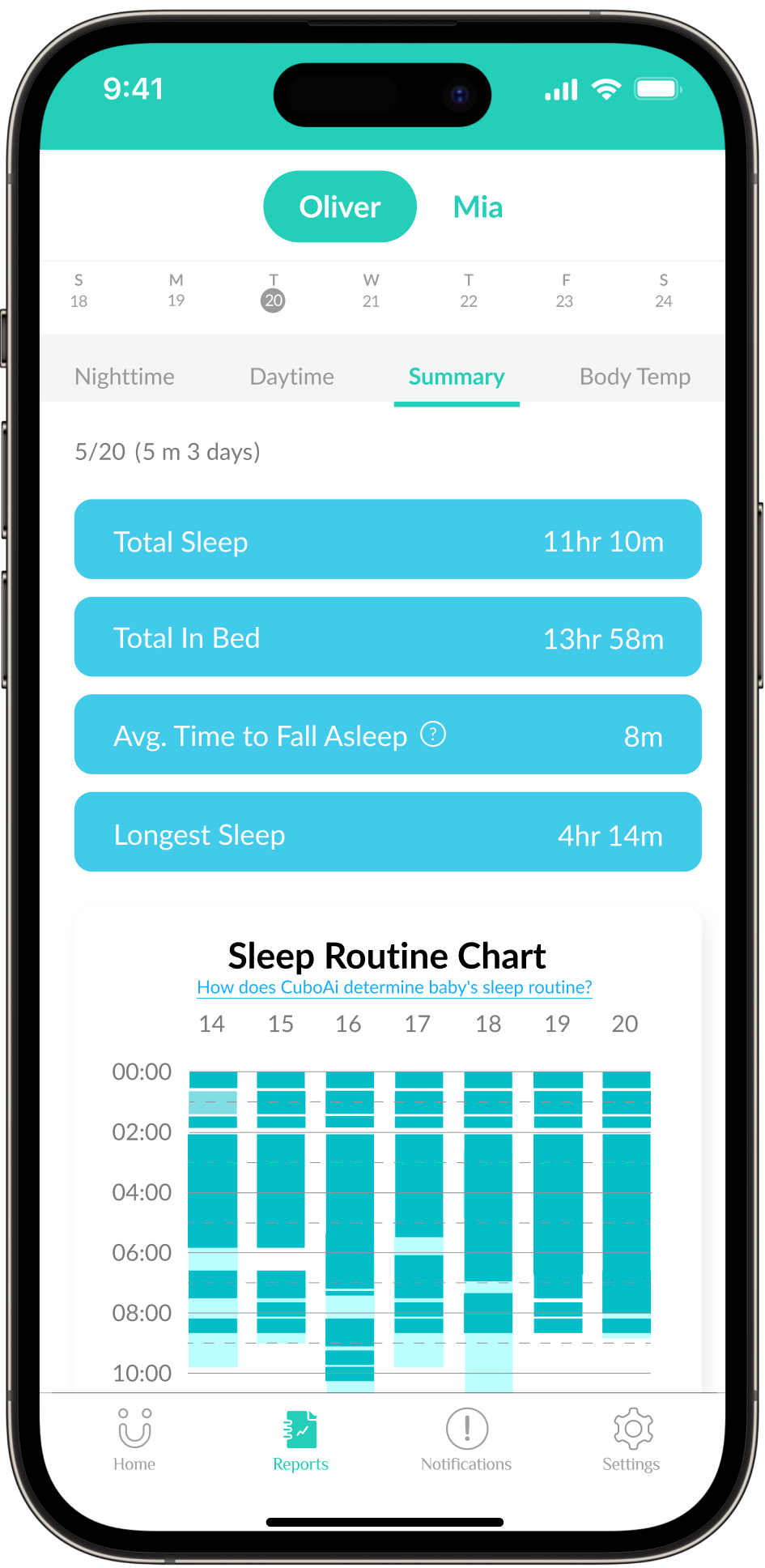 Get a summary of Baby's sleep, day and night