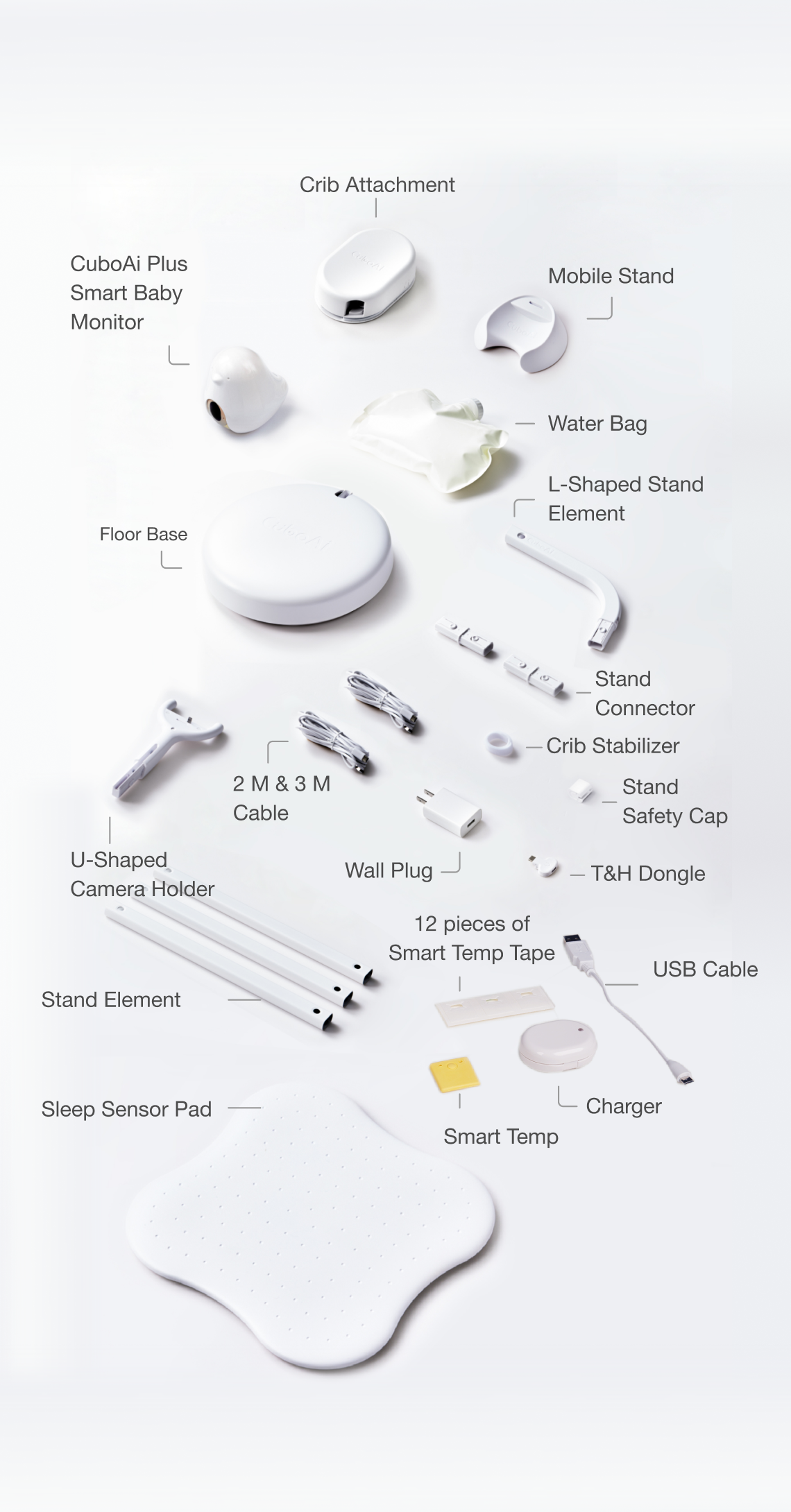 This bundle includes a CuboAi Smart Baby Monitor (3-Stand Set), a Sleep Sensor Pad, and a Smart Temp. Our Camera AI uses computer vision to watch over Baby, while working with the Sleep Sensor Pad to monitor Baby’s breathing motions and the Smart Temp to detect and record Baby’s body temperature in real-time.